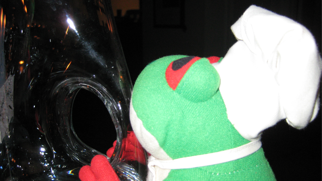 Chef Grenouille (grenouille is French for frog), a very cute FROG complete with a white apron and chef’s toque was received as a gift from her niece, Sarah. An entire imaginary world grew around him. This would not have been possible without Kevin Murrett, her best friend and husband. He gives life and personality to the FROGS. Without him they would just be cute, but silent stuffed animals. BTW… we never refer to them as stuffed animals!